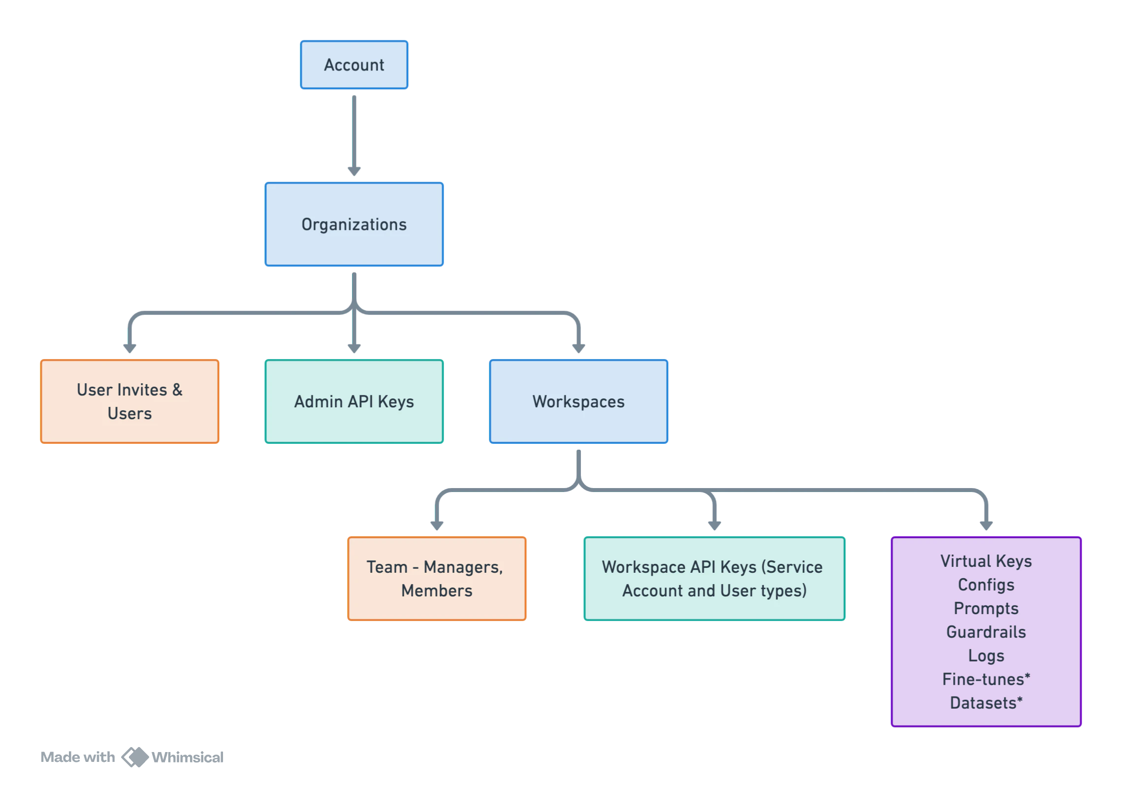 Organizations contain User Invites & Users, Admin API Keys, and Workspaces. Workspaces, in turn, have their own Team structure (with Managers and Members), Workspace API Keys, and various features like Integrations, Model Catalog, Configs, Prompts, and more. This structure enables you to: